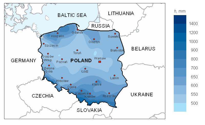 Map of Poland rain. Poland rain map (Eastern Europe - Europe) to print. Poland rain map (Eastern Europe - Europe) to download. Early autumn is generally sunny and warm before a period of rainy, colder weather in November begins the transition into winter. Winter, which may last from one to three months, brings frequent snowstorms but relatively low total precipitation. The average annual precipitation for the whole country is 600 mm (23.6 in), but isolated mountain locations receive as much as 1,300 mm (51.2 in) per year as its shown in Poland rain map. The total is slightly higher in the southern uplands than in the central plains. A few areas, notably along the Vistula between Warsaw and the Baltic Sea and in the far northwest, average less than 500 mm (19.7 in). In winter about half the precipitation in the lowlands and the entire amount in the mountains falls as snow. On the average, precipitation in summer is twice that in winter, providing a dependable supply of water for crops.