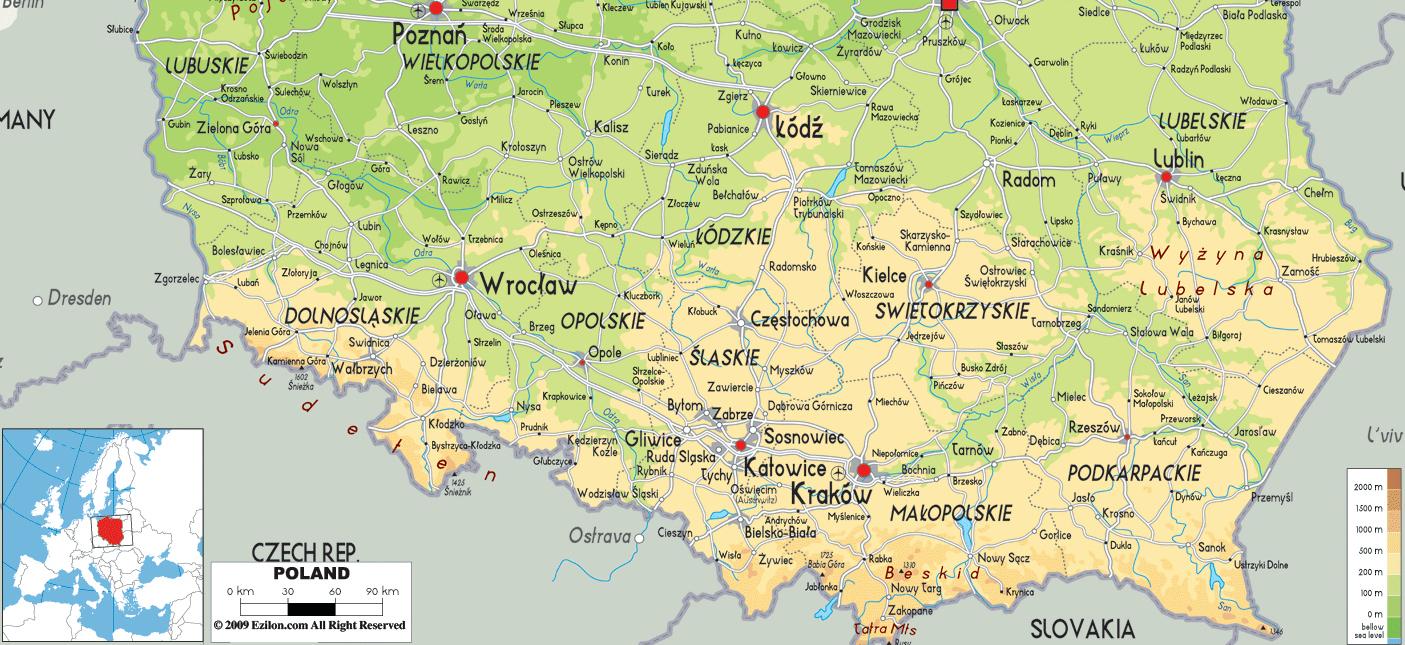 Map of southern Poland. Map of south Poland (Eastern Europe - Europe) to print. Map of south Poland (Eastern Europe - Europe) to download. South Poland attracts more visitors than any other region in the country, and its appeal is clear from a glance at the map. The Tatra Mountains bordering Slovakia are the most spectacular in the country, snowcapped for much of the year and markedly alpine in feel. The former royal capital of Kraków is an architectural gem and the country intellectual heart. Pope John Paul II was archbishop here until his election in 1978, but equally important are the city Jewish roots: before the Holocaust, this was one of Europe most vibrant Jewish centres. This multicultural past echoes in the old district of Kazimierz, and its culmination is starkly enshrined at the death camps of Auschwitz-Birkenau, 50km west of the city as its shown in the map of south Poland.
